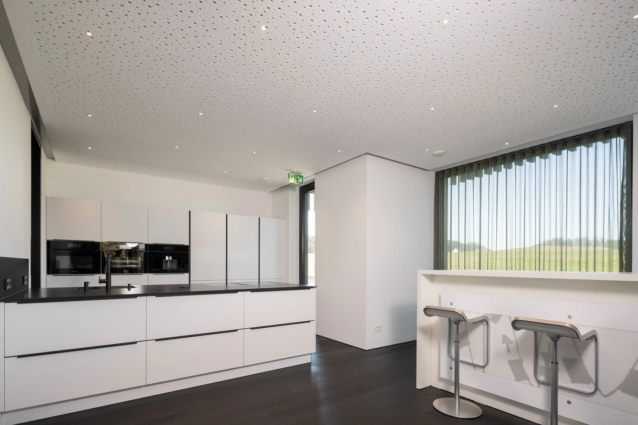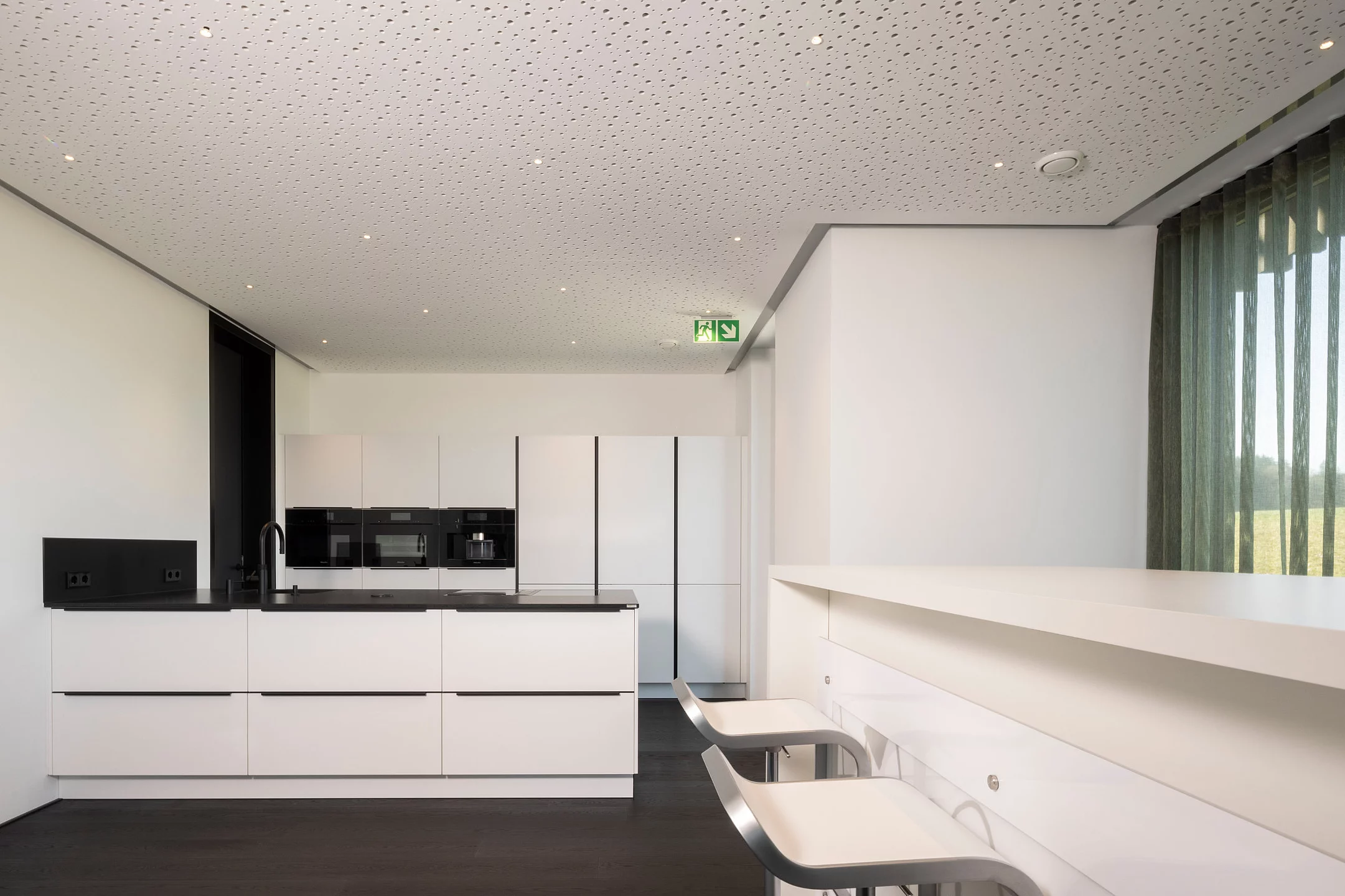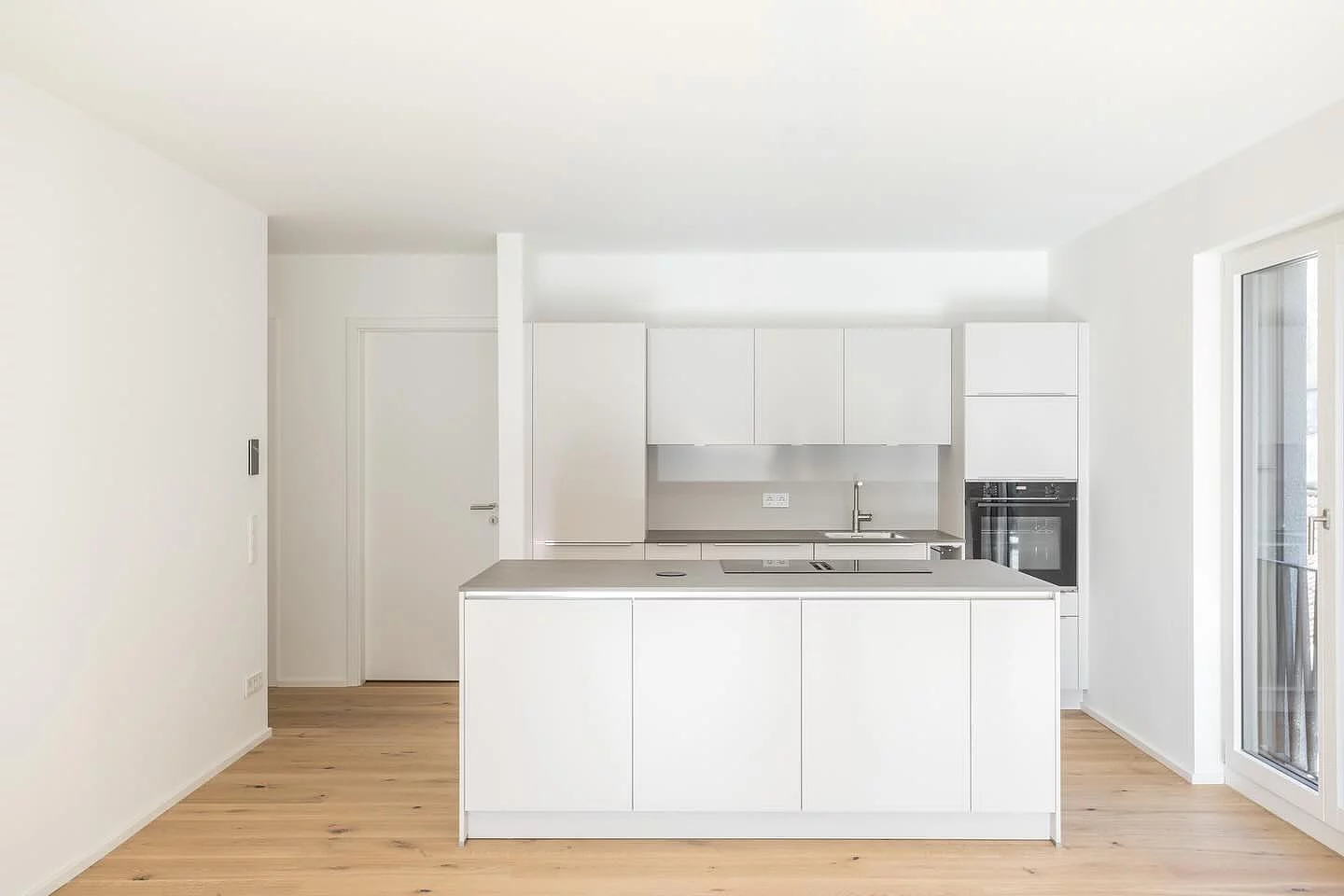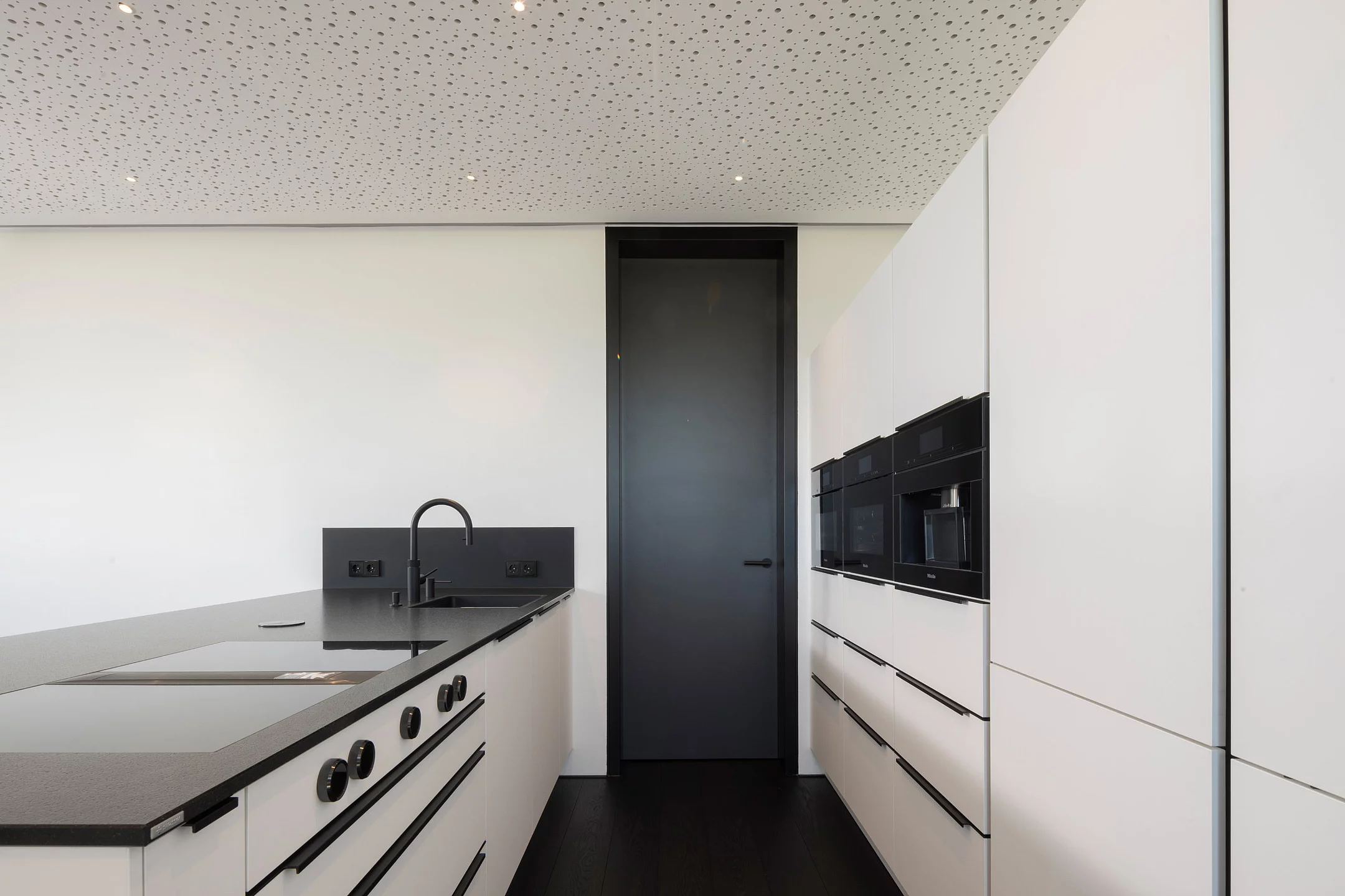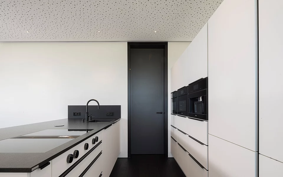 Eventküche in Bad Waldsee: Klare, moderne Linien in kristallweißem Mattlack mit schwarzen, eloxierten Griffleisten und grifflosen Hochschränken. Satinierte Naturstein-Arbeitsplatte aus Nero Assoluto, hochwertige Einbaugeräte inklusive integrierter Kaffeemaschine, Kochfeldabzug, schwarzes Spülbecken und elegante Glasrückwand. Highlight ist die großzügige Eventküche mit separater Arbeitsküche im Nebenraum, verbunden durch eine Schiebetür – ideal für Vorbereitung und Veranstaltungen.